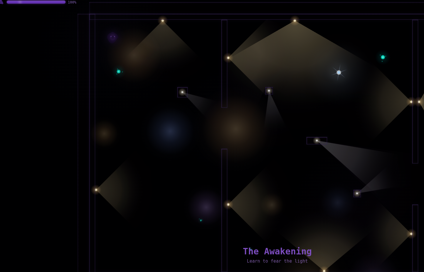 Light is your enemy. It burns, it hunts, it never stops. Navigate through 10 increasingly dangerous zones filled with lampposts, pulsing orbs, and rotating beams. Stay in the dark. Collect shadow fragments. Reach the exit.