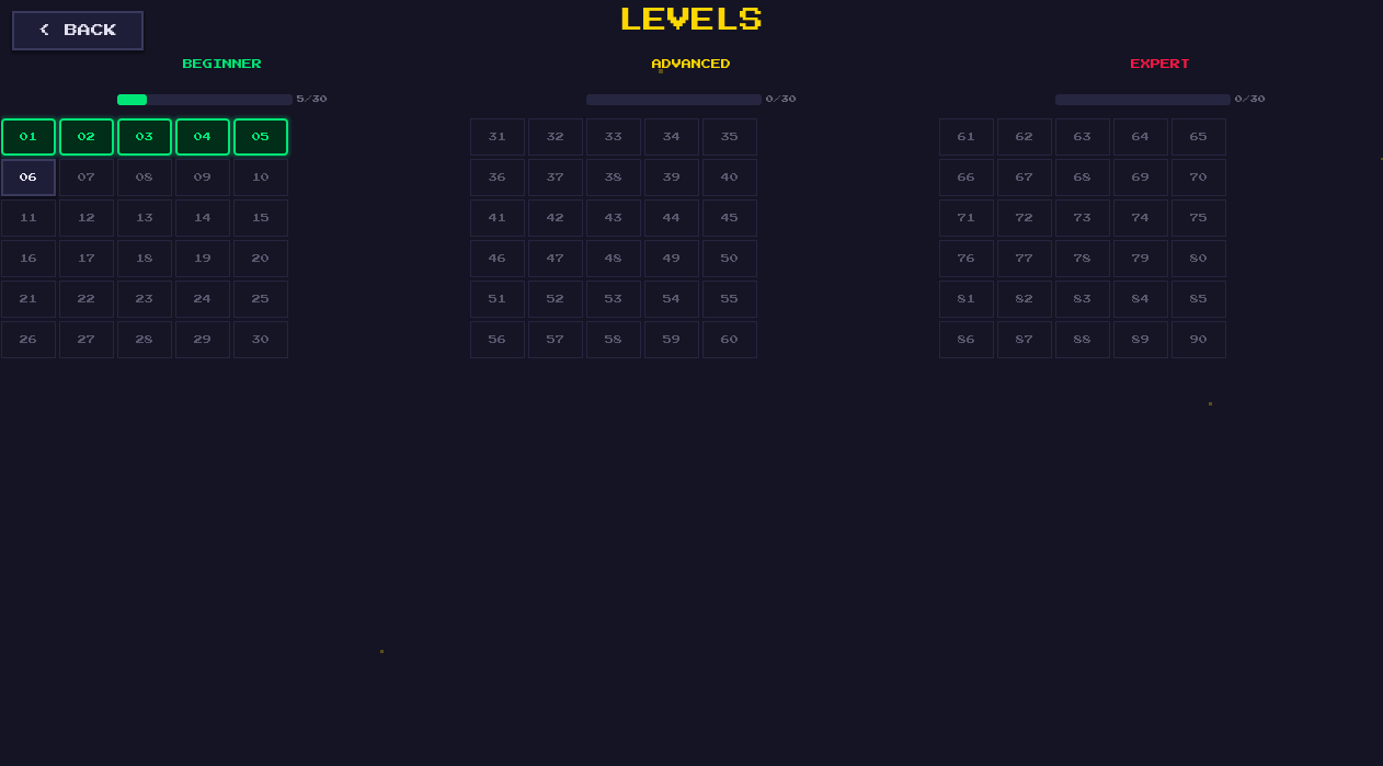 - 90 hand-crafted levels across 3 difficulty tiers